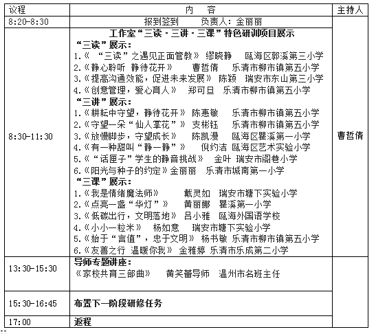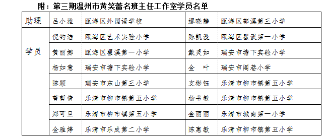 为贯彻《教育部关于进一步加强中小学班主任工作的意见》文件精神,为发挥名师的示范辐射作用,加快班主任队伍建设,提高班主任专业素养, 同时根据工作室培养计划,决定开展关于举行第三期温州市黄笑蕾名班主任工作室第二十六次线下集训、瓯海区黄笑蕾名班主任红色先锋工作室第31次活动暨第三期温州市黄笑蕾名班主任工作室结业典礼。现将有关事项通知如下: