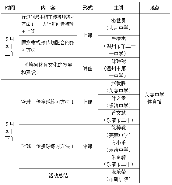 为进一步发挥骨干教师的教学示范与名师团队的引领、辐射作用,促进教师专业水平的提升,共同探讨“教会、勤练、常赛”视角下的单元设计与教学实践。根据研修计划,决定举行温州市郑玲彩“名师送教”工作室第15次活动乐清市普职高体育与健康选项教学研讨活动。现将有关事项安排如下: