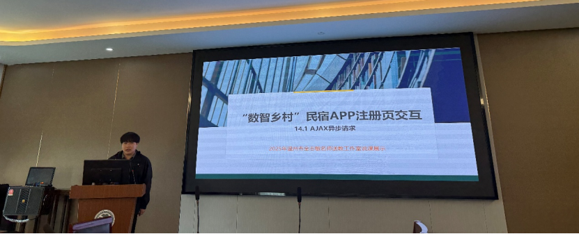 张灿老师在《WPS图表的使用》说课中,将“先学后教”思路贯穿全程:学生通过微课、问卷和学习任务单完成前置自学,再借助ChatExcel快速生成可视化图表。任务数据取自“手机使用时长”,AI辅助分析,既训练图表技能,又引导学生反思健康用机,实现知识、能力与素养三线并行。潘康妮老师《CSS弹性布局——智慧步道大屏的设计与制作》的说课以真实大屏需求为切入点,采用“高效教学+自主探究”双轨并行策略,重构岗课一体项目;同步嵌入实时互动评学系统,实现全过程、多维度数据采集与反馈,凸显信息技术深度赋能课堂的思路。张良老师在《AJAX异步请求——数智乡村民宿APP注册页交互》中展示自研批改程序,秒级反馈代码错误;将赛事项目转化为教学任务,学生完成“注册-校验-提示”完整闭环,配合三维度增值评价,清晰呈现岗课赛证融合路径。